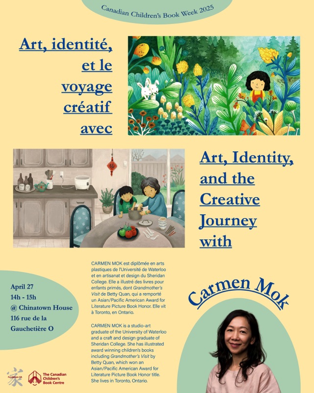 In this artist talk, Carmen Mok, a Hong Kong native who moved to Canada to study fine art, will share her journey of self-discovery as a Chinese Canadian and how her multicultural upbringing has shaped and enriched her illustration career. From pursuing her passion to building a career in children’s book illustration, she will take you behind the scenes of her book-making process, offering insights, practical tips, and personal stories about both the challenges and joys of her work.