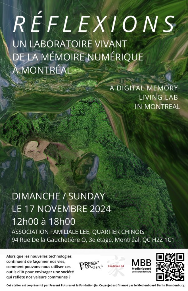 “Reflections: A Digital Memory Workshop in Chinatown (Montreal)” is a 6-hour workshop facilitated by Chloé Lee, creator of Temporal World (SXSW 2023). In the workshop, she shares her creative process, guiding groups and individuals to reflect on their communities through writing exercises, interviews and experimentation with AI image generation. The workshop is for anyone: people of all skill levels, backgrounds and ages, and all needed technology will be provided. We will reflect on what community means to each of us. By the end of the day, our creations will be installed and shown in a collective 3D interactive virtual gallery built with Unity. The gallery showcases the work and ideas created by the mix of people who come for this one-day event.