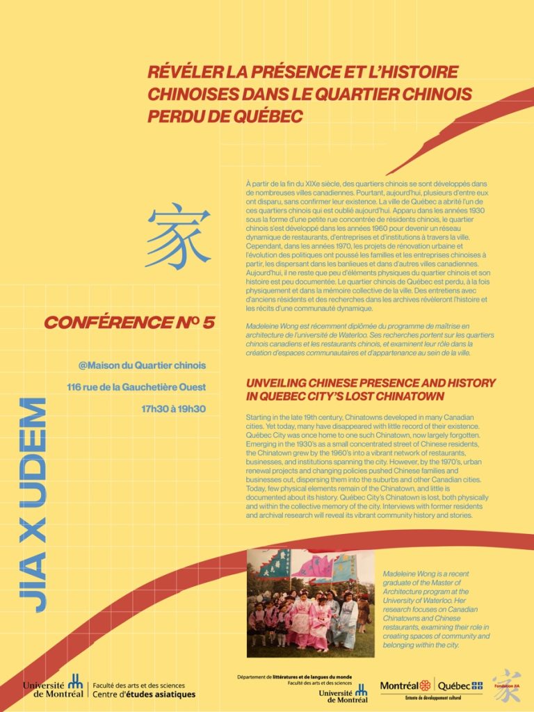 À partir de la fin du XIXe siècle, des quartiers chinois se sont développés dans de nombreuses villes canadiennes. Pourtant, aujourd’hui, nombre d’entre eux ont disparu, parfois sans laisser de trace de leur existence. La ville de Québec a abrité l’un de ces quartiers chinois, aujourd’hui largement oublié. Apparu dans les années 1930 sous la forme d’une petite rue peuplée de résidents chinois, le quartier chinois s’est développé dans les années 1960 pour devenir un réseau dynamique de restaurants, d’entreprises et d’institutions à travers la ville. Cependant, dans les années 1970, les projets de développement urbain et l’évolution des politiques publiques ont poussé les familles et les entreprises chinoises à s’exiler, les dispersant dans les banlieues et dans d’autres villes canadiennes. Aujourd’hui, il ne reste que peu d’éléments physiques du quartier chinois et son histoire est peu documentée. Le quartier chinois de Québec est perdu, à la fois physiquement et dans la mémoire collective de la ville. Dans cette conférence, des entretiens avec d’anciens résidents et des recherches dans les archives révèleront l’histoire et les récits d’une communauté dynamique.